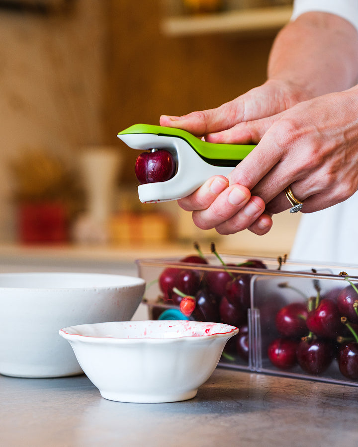 Quickly remove stones and stems with this 2-in-1 tool. The cherry stoner function removes pits, while the tweezer-like hulling tool is an efficient strawberry stem remover.