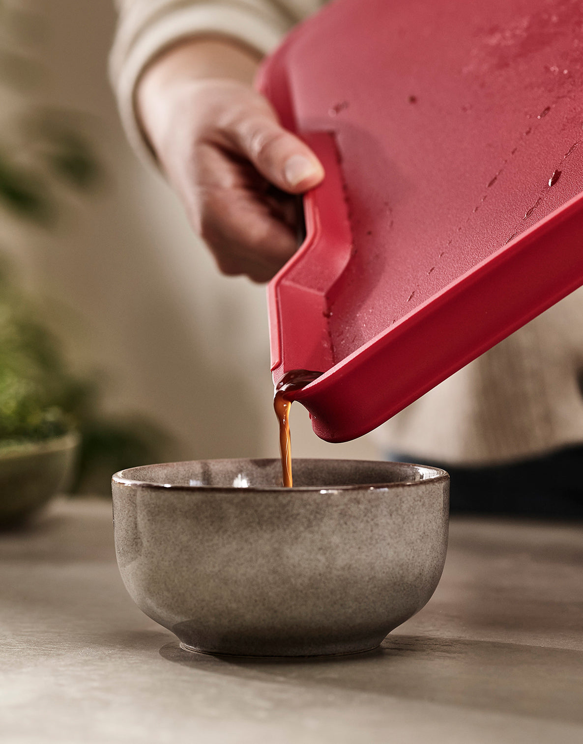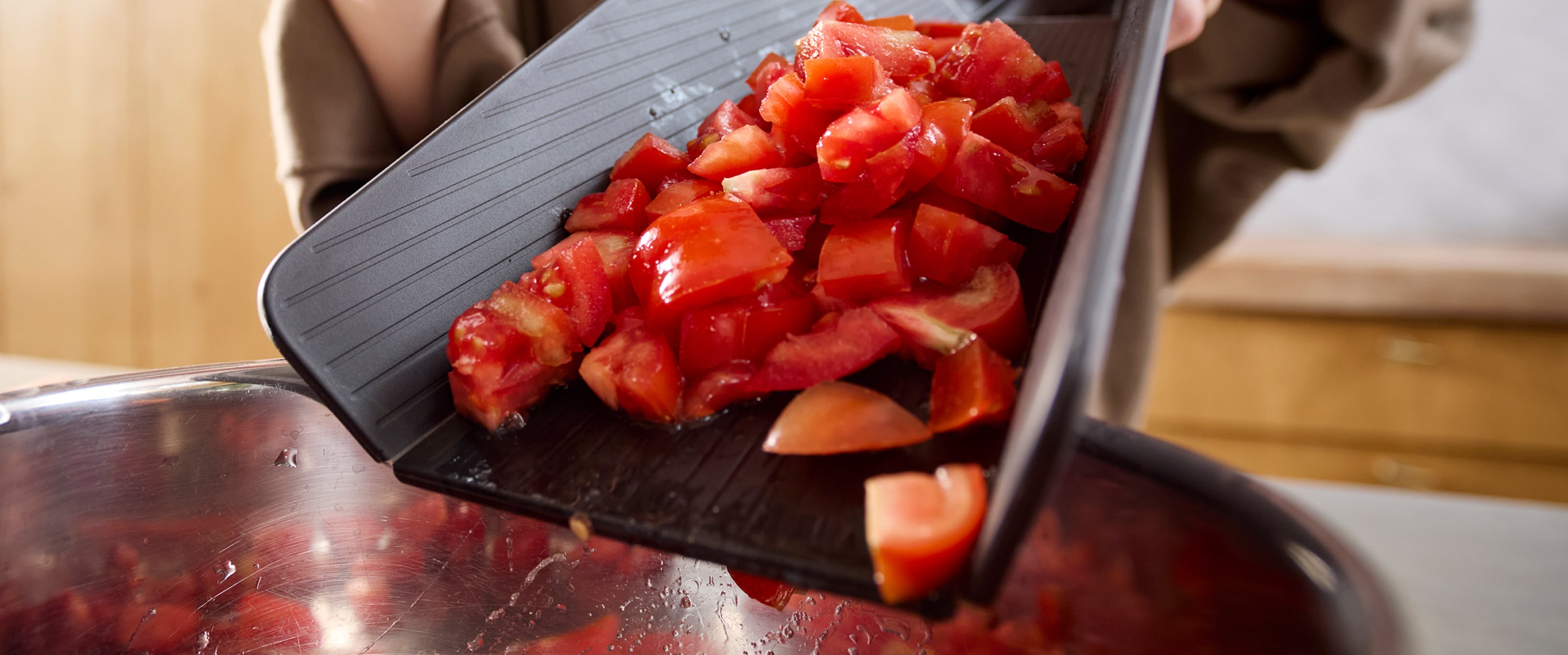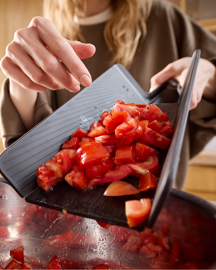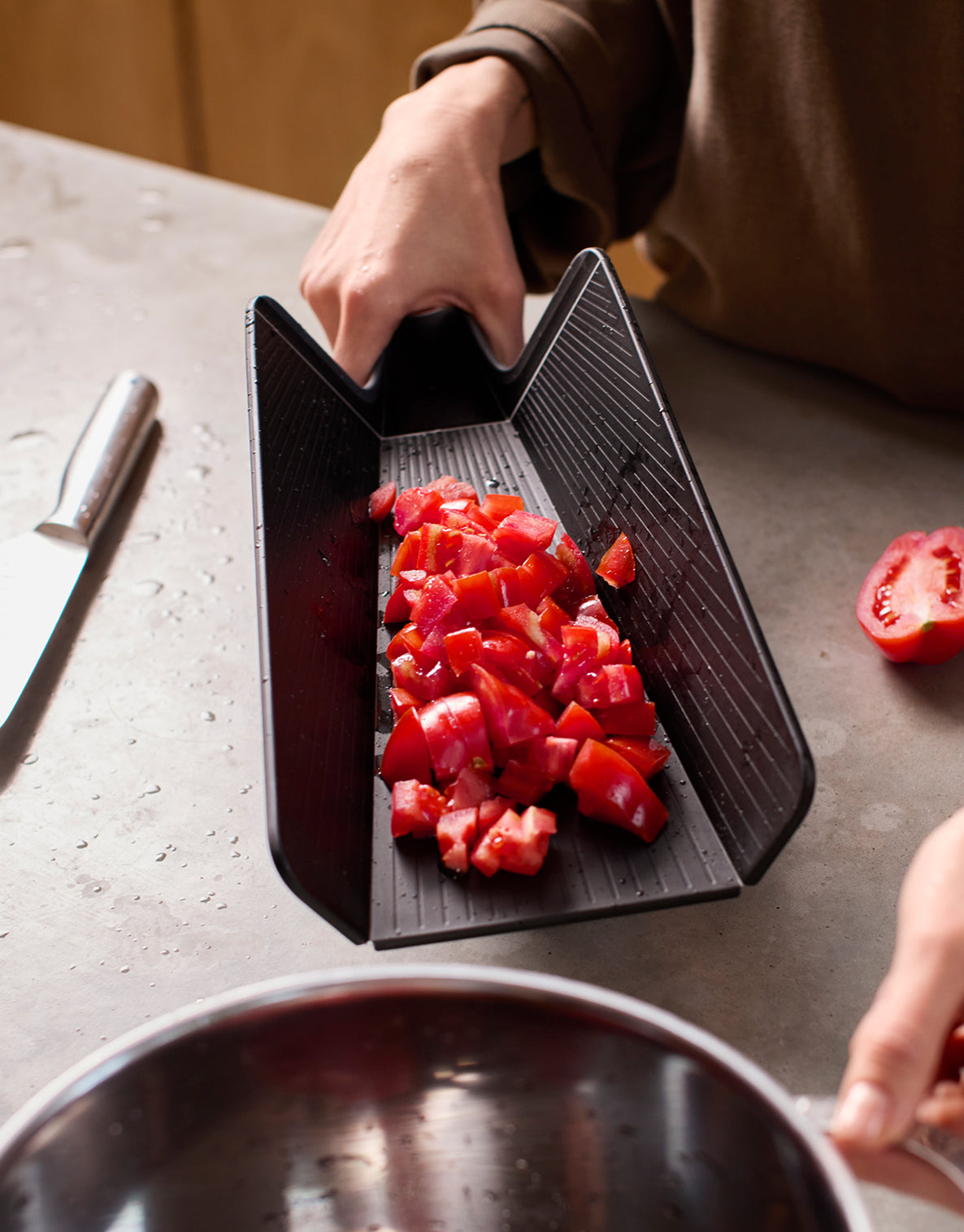 Our award-winning Chop2Pot™ cutting board cuts out the mess of moving chopped food into pans or off-cuts into the compost caddy. The clever, foldable design creates a chute for easy pouring and no-mess food transfer. Simply squeeze the soft-grip handle, and the edges of the board fold.