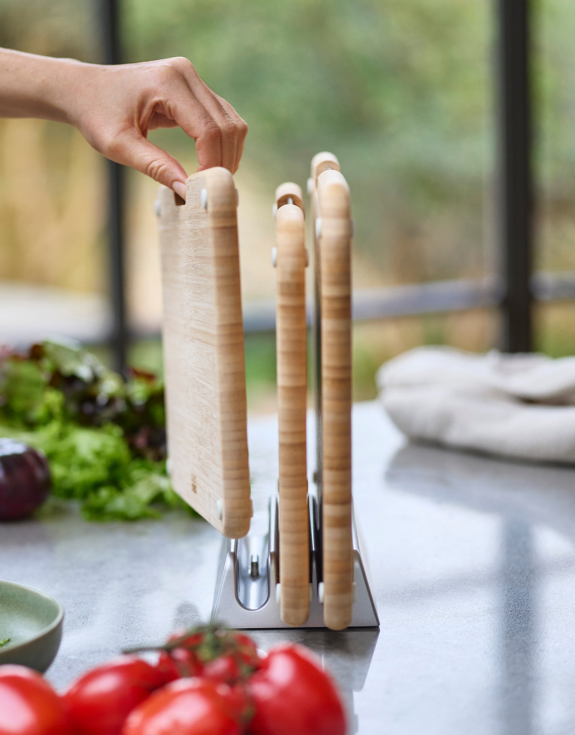 Nest™ is the must-have, space-saving kitchenware range that includes mixing bowls, cookware, utensils, and cutting boards. The 3-piece, color-coded cutting board sets keep space-saving at their core with a neat, organized storage stand that holds the boards slightly apart to improve airflow. Stainless-steel bars allow for easy board selection from the stand, while the knife-friendly, textured cutting surfaces are a joy to chop on. Available in regular or large sizes, they are designed for all kinds of kitchens and cutting needs.