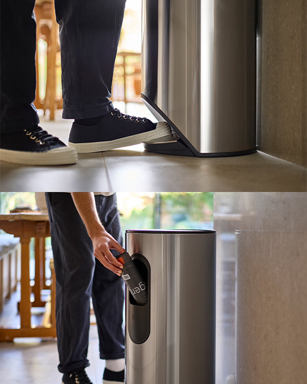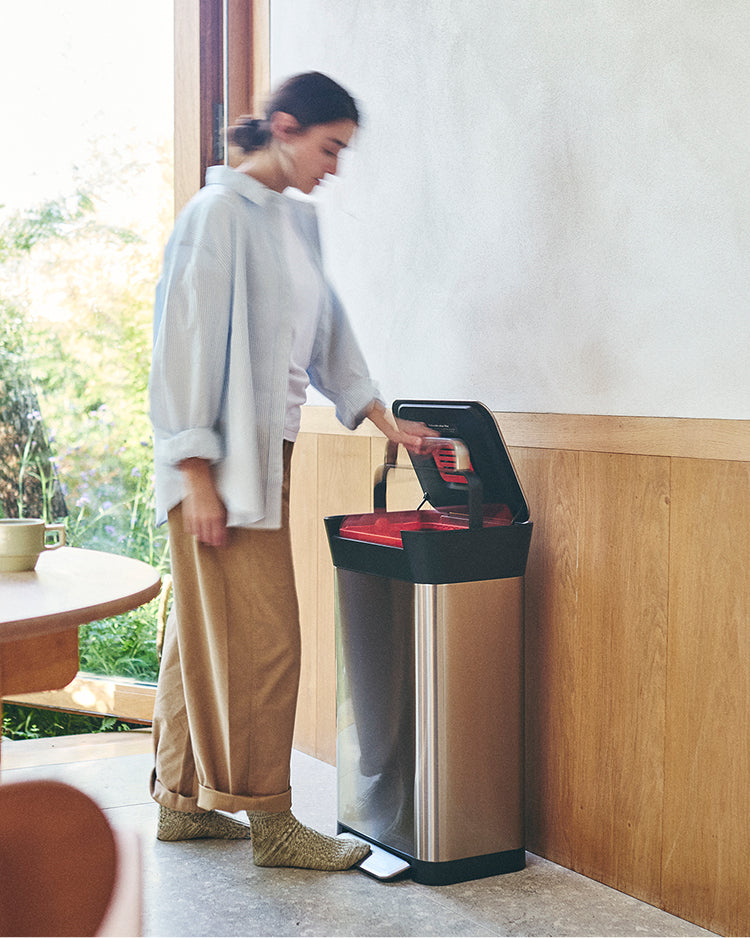If you’re looking for a streamlined waste solution, consider Arc™, which has a pedal within the body of the trash can itself. It boasts a handy pocket which stores replacement garbage bags at the back of the trash can, so that you always have bags on hand when you need them most. Arc™ stores 30L of waste, and is also available in a smaller 10L format. Foot pedals are especially handy when you’re in the middle of a messy kitchen task and don’t want to use your hands to open the bin. The lid is soft-close for a satisfying and smooth experience.