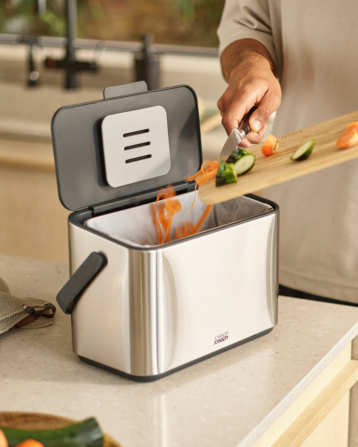 Our food waste caddies are easy-to-fill and are designed to reduce mess during meal prep, keeping your kitchen clean and tidy. Collect™ is made of stainless-steel which is a durable material as well as a good one for blocking out smells. It has an integrated odor filter, which hides discreetly on the underside of the compost bin lid.