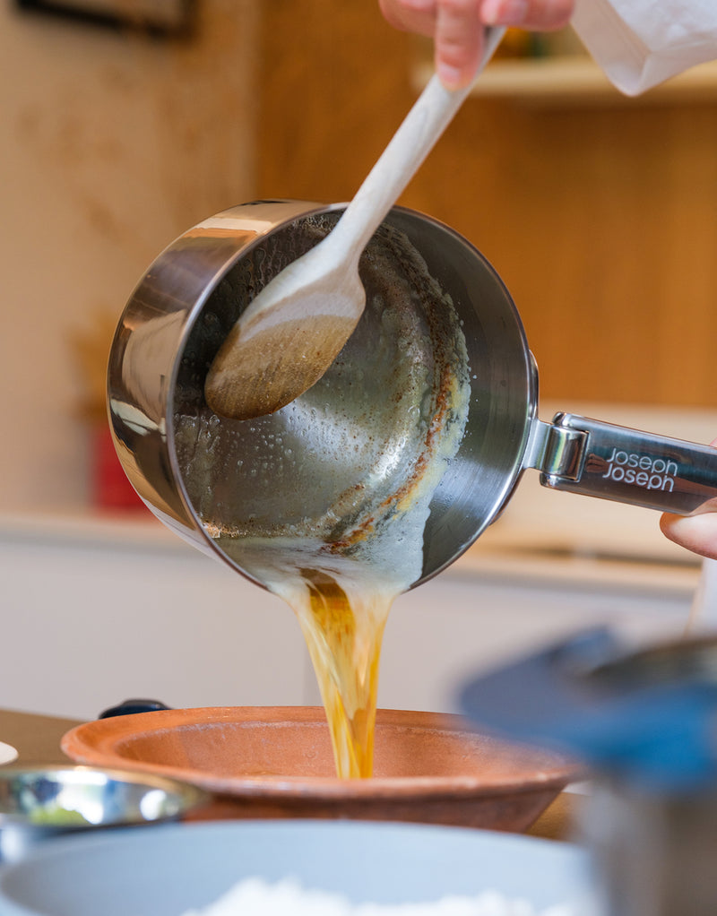 - Step 1In a saucepan over a low-medium heat, melt the butter and cook it, stirring frequently, until the bubbling stops and the solids begin to turn brown and smell nutty (about 7-8 minutes). Be sure no milk solids are stuck on the bottom of your pan as these can burn easily.
