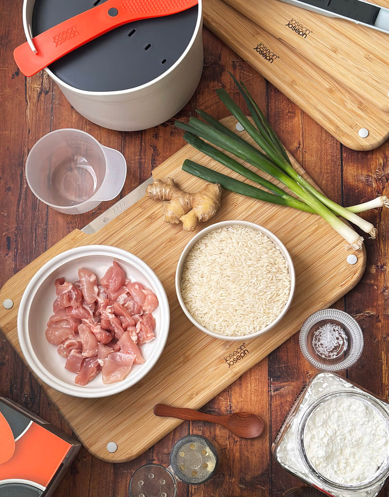 - Step 1Rinse the jasmine rice in the M-Cuisine™ Microwave Rice Cooker colander. Place the colander into the cooking pot and add the required amount of water. Soak for 30 minutes. Marinate the diced chicken with the cooking wine, soy sauce, white pepper and cornflour. Set aside.