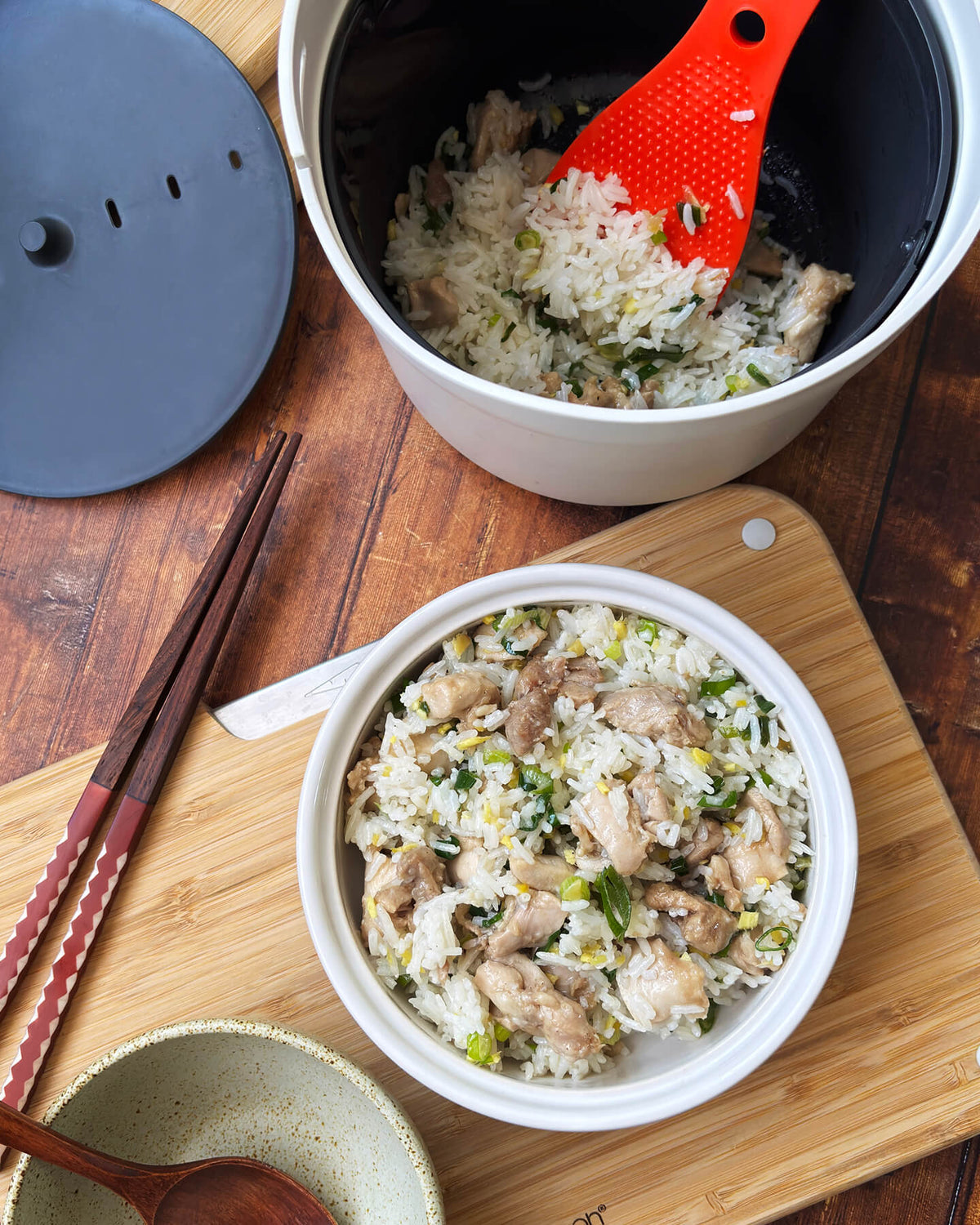 In this recipe, Wanting Huang (@iswanting) layers chicken over rice so everything cooks together, then finishes the dish with a fragrant spring onion and ginger sauce. It’s simple, fuss-free, and perfect for a comforting meal at home. The rice and chicken cook together in one pot, finished with a fragrant spring onion and ginger sauce for an irresistible burst of aroma. It’s easy, satisfying, and ideal for busy days.