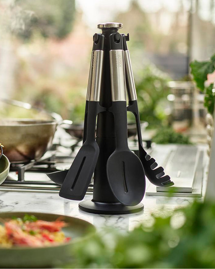 Master the art of omelette-making with a silicone slotted turner. Its sleek design allows for easy flipping while protecting your non-stick pans. The Elevate™ Stainless-Steel 6-piece Utensils Carousel Set keeps mess at bay with an integrated tool rest on each utenstil, helping to prevent food touching your counter.