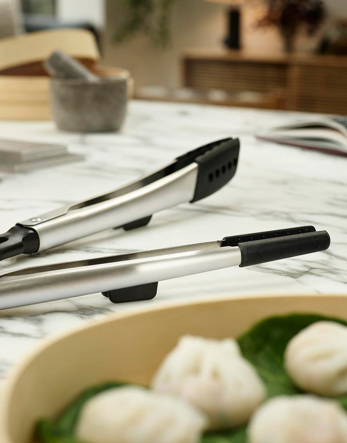 A sturdy pair of tongs is your go-to for flipping, turning, and serving delicate foods. The Elevate™ Fusion Tongs feature silicone tips to prevent scratching cookware and a clever locking mechanism for compact storage.